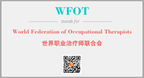 英文缩略词“WFOT”经常作为“World Federation of Occupational Therapists”的英文缩写来使用,中文表示:“世界职业治疗师联合会”。本文将详细介绍英文缩写词WFOT所代表英文单词,其对应的中文拼音、详细解释以及在英语中的流行度。此外,还有关于缩略词WFOT的分类、应用领域及相关应用示例等。