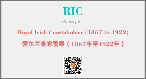 上述内容是“Royal Irish Constabulary (1867 to 1922)”作为“RIC”的缩写,解释为“爱尔兰皇家警察(1867年至1922年)”时的信息,以及英文缩略词RIC所代表的英文单词,其对应的中文拼音、详细解释以及在英文中的流行度和相关分类、应用领域及应用示例等。