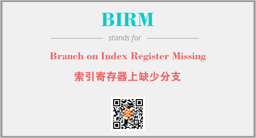 上述内容是“Branch on Index Register Missing”作为“BIRM”的缩写,解释为“索引寄存器上缺少分支”时的信息,以及英文缩略词BIRM所代表的英文单词,其对应的中文拼音、详细解释以及在英文中的流行度和相关分类、应用领域及应用示例等。