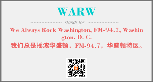 上述内容是“We Always Rock Washington, FM-94.7, Washington, D. C.”作为“WARW”的缩写,解释为“我们总是摇滚华盛顿,FM-94.7,华盛顿特区。”时的信息,以及英文缩略词WARW所代表的英文单词,其对应的中文拼音、详细解释以及在英文中的流行度和相关分类、应用领域及应用示例等。
