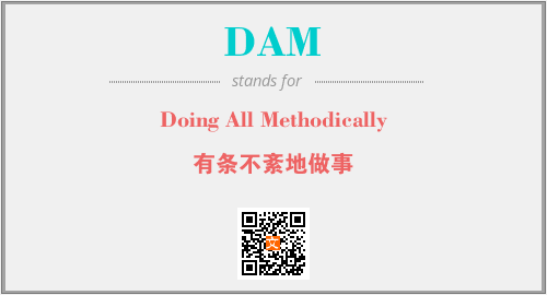 上述内容是“Doing All Methodically”作为“DAM”的缩写,解释为“有条不紊地做事”时的信息,以及英文缩略词DAM所代表的英文单词,其对应的中文拼音、详细解释以及在英文中的流行度和相关分类、应用领域及应用示例等。