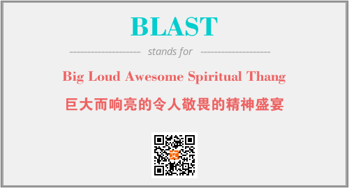 上述内容是“Big Loud Awesome Spiritual Thang”作为“BLAST”的缩写,解释为“巨大而响亮的令人敬畏的精神盛宴”时的信息,以及英文缩略词BLAST所代表的英文单词,其对应的中文拼音、详细解释以及在英文中的流行度和相关分类、应用领域及应用示例等。