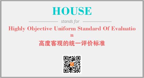 上述内容是“Highly Objective Uniform Standard Of Evaluation”作为“HOUSE”的缩写,解释为“高度客观的统一评价标准”时的信息,以及英文缩略词HOUSE所代表的英文单词,其对应的中文拼音、详细解释以及在英文中的流行度和相关分类、应用领域及应用示例等。