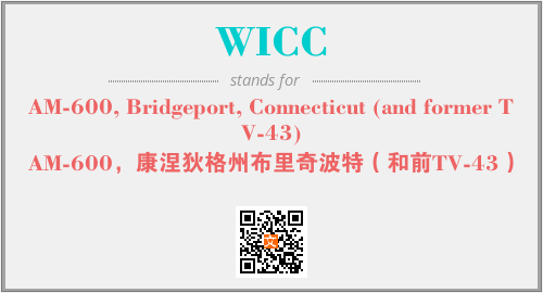 上述内容是“AM-600, Bridgeport, Connecticut (and former TV-43)”作为“WICC”的缩写,解释为“AM-600,康涅狄格州布里奇波特(和前TV-43)”时的信息,以及英文缩略词WICC所代表的英文单词,其对应的中文拼音、详细解释以及在英文中的流行度和相关分类、应用领域及应用示例等。