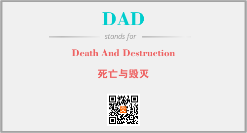 上述内容是“Death And Destruction”作为“DAD”的缩写,解释为“死亡与毁灭”时的信息,以及英文缩略词DAD所代表的英文单词,其对应的中文拼音、详细解释以及在英文中的流行度和相关分类、应用领域及应用示例等。