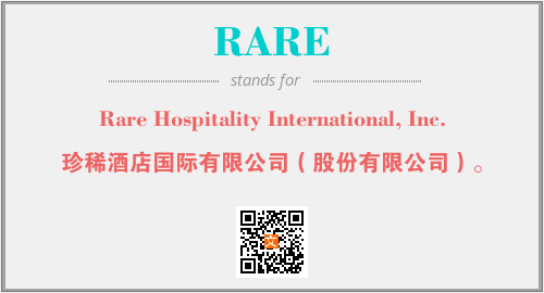 上述内容是“Rare Hospitality International, Inc.”作为“RARE”的缩写,解释为“珍稀酒店国际有限公司(股份有限公司)。”时的信息,以及英文缩略词RARE所代表的英文单词,其对应的中文拼音、详细解释以及在英文中的流行度和相关分类、应用领域及应用示例等。