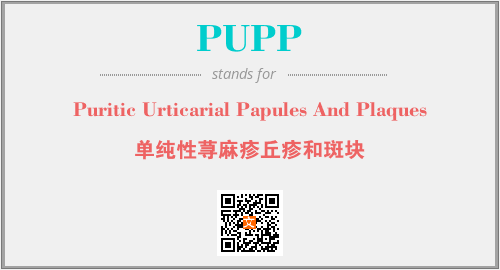 上述内容是“Puritic Urticarial Papules And Plaques”作为“PUPP”的缩写,解释为“单纯性荨麻疹丘疹和斑块”时的信息,以及英文缩略词PUPP所代表的英文单词,其对应的中文拼音、详细解释以及在英文中的流行度和相关分类、应用领域及应用示例等。