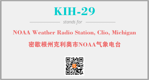 上述内容是“NOAA Weather Radio Station, Clio, Michigan”作为“KIH-29”的缩写,解释为“密歇根州克利奥市NOAA气象电台”时的信息,以及英文缩略词KIH-29所代表的英文单词,其对应的中文拼音、详细解释以及在英文中的流行度和相关分类、应用领域及应用示例等。