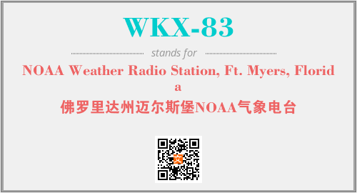 上述内容是“NOAA Weather Radio Station, Ft. Myers, Florida”作为“WKX-83”的缩写,解释为“佛罗里达州迈尔斯堡NOAA气象电台”时的信息,以及英文缩略词WKX-83所代表的英文单词,其对应的中文拼音、详细解释以及在英文中的流行度和相关分类、应用领域及应用示例等。