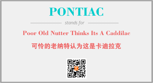 上述内容是“Poor Old Nutter Thinks Its A Caddilac”作为“PONTIAC”的缩写,解释为“可怜的老纳特认为这是卡迪拉克”时的信息,以及英文缩略词PONTIAC所代表的英文单词,其对应的中文拼音、详细解释以及在英文中的流行度和相关分类、应用领域及应用示例等。
