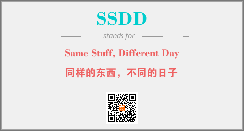 上述内容是“Same Stuff, Different Day”作为“SSDD”的缩写,解释为“同样的东西,不同的日子”时的信息,以及英文缩略词SSDD所代表的英文单词,其对应的中文拼音、详细解释以及在英文中的流行度和相关分类、应用领域及应用示例等。