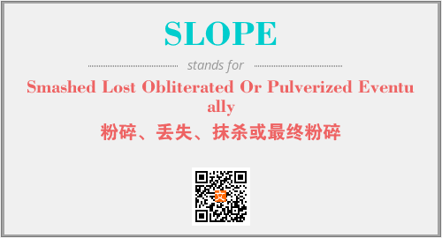 以上为Smashed Lost Obliterated Or Pulverized Eventually英文缩略词SLOPE的中文解释,以及该英文缩写在英语的流行度、分类和应用领域方面的信息。