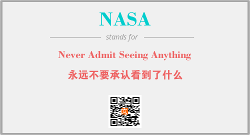上述内容是“Never Admit Seeing Anything”作为“NASA”的缩写,解释为“永远不要承认看到了什么”时的信息,以及英文缩略词NASA所代表的英文单词,其对应的中文拼音、详细解释以及在英文中的流行度和相关分类、应用领域及应用示例等。