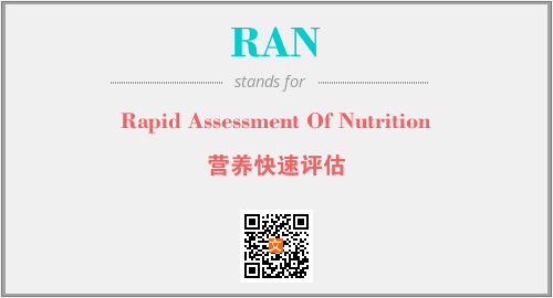 英文缩略词“RAN”经常作为“Rapid Assessment Of Nutrition”的英文缩写来使用,中文表示:“营养快速评估”。本文将详细介绍英文缩写词RAN所代表英文单词,其对应的中文拼音、详细解释以及在英语中的流行度。此外,还有关于缩略词RAN的分类、应用领域及相关应用示例等。