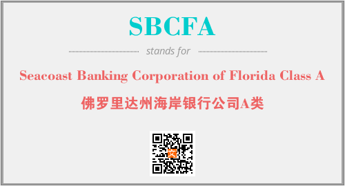上述内容是“Seacoast Banking Corporation of Florida Class A”作为“SBCFA”的缩写,解释为“佛罗里达州海岸银行公司A类”时的信息,以及英文缩略词SBCFA所代表的英文单词,其对应的中文拼音、详细解释以及在英文中的流行度和相关分类、应用领域及应用示例等。