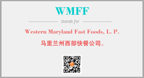 上述内容是“Western Maryland Fast Foods, L. P.”作为“WMFF”的缩写,解释为“马里兰州西部快餐公司。”时的信息,以及英文缩略词WMFF所代表的英文单词,其对应的中文拼音、详细解释以及在英文中的流行度和相关分类、应用领域及应用示例等。