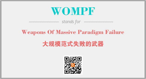 上述内容是“Weapons Of Massive Paradigm Failure”作为“WOMPF”的缩写,解释为“大规模范式失败的武器”时的信息,以及英文缩略词WOMPF所代表的英文单词,其对应的中文拼音、详细解释以及在英文中的流行度和相关分类、应用领域及应用示例等。