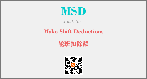 上述内容是“Make Shift Deductions”作为“MSD”的缩写,解释为“轮班扣除额”时的信息,以及英文缩略词MSD所代表的英文单词,其对应的中文拼音、详细解释以及在英文中的流行度和相关分类、应用领域及应用示例等。