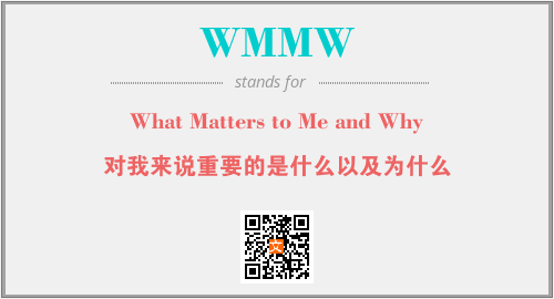 上述内容是“What Matters to Me and Why”作为“WMMW”的缩写,解释为“对我来说重要的是什么以及为什么”时的信息,以及英文缩略词WMMW所代表的英文单词,其对应的中文拼音、详细解释以及在英文中的流行度和相关分类、应用领域及应用示例等。
