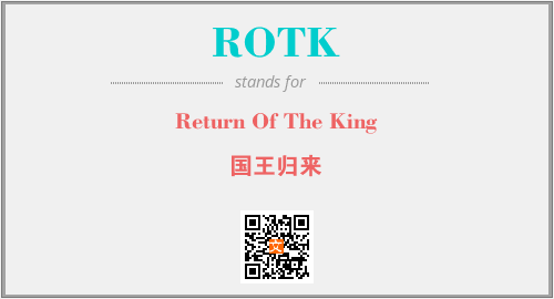 上述内容是“Return Of The King”作为“ROTK”的缩写,解释为“国王归来”时的信息,以及英文缩略词ROTK所代表的英文单词,其对应的中文拼音、详细解释以及在英文中的流行度和相关分类、应用领域及应用示例等。