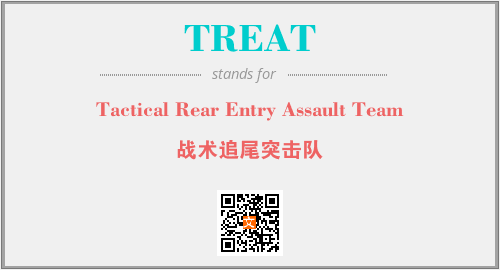 上述内容是“Tactical Rear Entry Assault Team”作为“TREAT”的缩写,解释为“战术追尾突击队”时的信息,以及英文缩略词TREAT所代表的英文单词,其对应的中文拼音、详细解释以及在英文中的流行度和相关分类、应用领域及应用示例等。