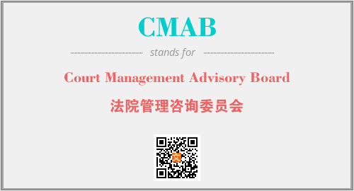 英文缩略词“CMAB”经常作为“Court Management Advisory Board”的英文缩写来使用,中文表示:“法院管理咨询委员会”。本文将详细介绍英文缩写词CMAB所代表英文单词,其对应的中文拼音、详细解释以及在英语中的流行度。此外,还有关于缩略词CMAB的分类、应用领域及相关应用示例等。