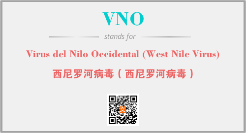 上述内容是“Virus del Nilo Occidental (West Nile Virus)”作为“VNO”的缩写,解释为“西尼罗河病毒(西尼罗河病毒)”时的信息,以及英文缩略词VNO所代表的英文单词,其对应的中文拼音、详细解释以及在英文中的流行度和相关分类、应用领域及应用示例等。