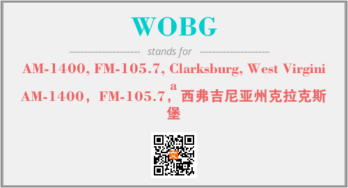 上述内容是“AM-1400, FM-105.7, Clarksburg, West Virginia”作为“WOBG”的缩写,解释为“AM-1400,FM-105.7,西弗吉尼亚州克拉克斯堡”时的信息,以及英文缩略词WOBG所代表的英文单词,其对应的中文拼音、详细解释以及在英文中的流行度和相关分类、应用领域及应用示例等。