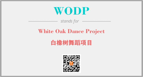 上述内容是“White Oak Dance Project”作为“WODP”的缩写,解释为“白橡树舞蹈项目”时的信息,以及英文缩略词WODP所代表的英文单词,其对应的中文拼音、详细解释以及在英文中的流行度和相关分类、应用领域及应用示例等。