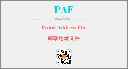 英文缩略词“PAF”经常作为“Postal Address File”的英文缩写来使用,中文表示:“邮政地址文件”。本文将详细介绍英文缩写词PAF所代表英文单词,其对应的中文拼音、详细解释以及在英语中的流行度。此外,还有关于缩略词PAF的分类、应用领域及相关应用示例等。