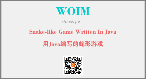 上述内容是“Snake-like Game Written In Java”作为“WOIM”的缩写,解释为“用Java编写的蛇形游戏”时的信息,以及英文缩略词WOIM所代表的英文单词,其对应的中文拼音、详细解释以及在英文中的流行度和相关分类、应用领域及应用示例等。
