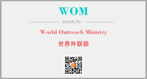 英文缩略词“WOM”经常作为“World Outreach Ministry”的英文缩写来使用,中文表示:“世界外联部”。本文将详细介绍英文缩写词WOM所代表英文单词,其对应的中文拼音、详细解释以及在英语中的流行度。此外,还有关于缩略词WOM的分类、应用领域及相关应用示例等。
