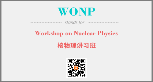 英文缩略词“WONP”经常作为“Workshop on Nuclear Physics”的英文缩写来使用,中文表示:“核物理讲习班”。本文将详细介绍英文缩写词WONP所代表英文单词,其对应的中文拼音、详细解释以及在英语中的流行度。此外,还有关于缩略词WONP的分类、应用领域及相关应用示例等。