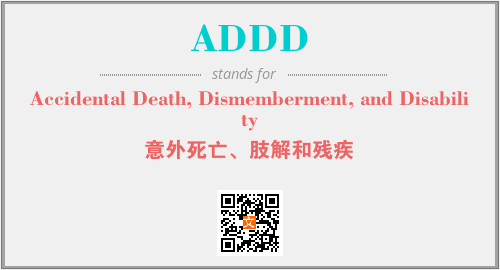 上述内容是“Accidental Death, Dismemberment, and Disability”作为“ADDD”的缩写,解释为“意外死亡、肢解和残疾”时的信息,以及英文缩略词ADDD所代表的英文单词,其对应的中文拼音、详细解释以及在英文中的流行度和相关分类、应用领域及应用示例等。