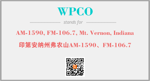 英文缩略词“WPCO”经常作为“AM-1590, FM-106.7, Mt. Vernon, Indiana”的英文缩写来使用,中文表示:“印第安纳州弗农山AM-1590、FM-106.7”。本文将详细介绍英文缩写词WPCO所代表英文单词,其对应的中文拼音、详细解释以及在英语中的流行度。此外,还有关于缩略词WPCO的分类、应用领域及相关应用示例等。