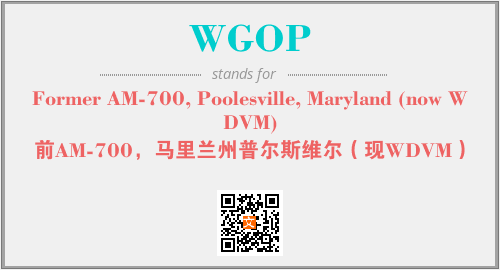 上述内容是“Former AM-700, Poolesville, Maryland (now WDVM)”作为“WGOP”的缩写,解释为“前AM-700,马里兰州普尔斯维尔(现WDVM)”时的信息,以及英文缩略词WGOP所代表的英文单词,其对应的中文拼音、详细解释以及在英文中的流行度和相关分类、应用领域及应用示例等。