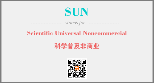 上述内容是“Scientific Universal Noncommercial”作为“SUN”的缩写,解释为“科学普及非商业”时的信息,以及英文缩略词SUN所代表的英文单词,其对应的中文拼音、详细解释以及在英文中的流行度和相关分类、应用领域及应用示例等。