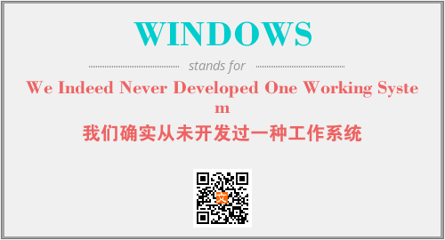 上述内容是“We Indeed Never Developed One Working System”作为“WINDOWS”的缩写,解释为“我们确实从未开发过一种工作系统”时的信息,以及英文缩略词WINDOWS所代表的英文单词,其对应的中文拼音、详细解释以及在英文中的流行度和相关分类、应用领域及应用示例等。