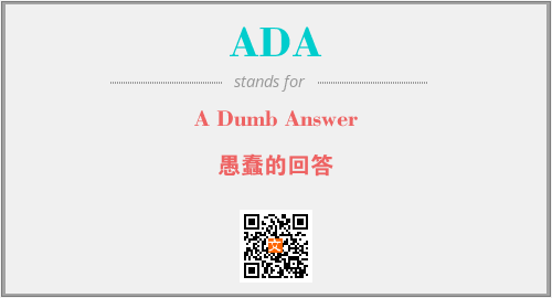 英文缩略词“ADA”经常作为“A Dumb Answer”的英文缩写来使用,中文表示:“愚蠢的回答”。本文将详细介绍英文缩写词ADA所代表英文单词,其对应的中文拼音、详细解释以及在英语中的流行度。此外,还有关于缩略词ADA的分类、应用领域及相关应用示例等。