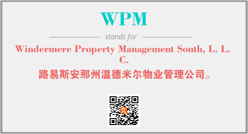 上述内容是“Windermere Property Management South, L. L. C.”作为“WPM”的缩写,解释为“路易斯安那州温德米尔物业管理公司。”时的信息,以及英文缩略词WPM所代表的英文单词,其对应的中文拼音、详细解释以及在英文中的流行度和相关分类、应用领域及应用示例等。