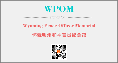 英文缩略词“WPOM”经常作为“Wyoming Peace Officer Memorial”的英文缩写来使用,中文表示:“怀俄明州和平官员纪念馆”。本文将详细介绍英文缩写词WPOM所代表英文单词,其对应的中文拼音、详细解释以及在英语中的流行度。此外,还有关于缩略词WPOM的分类、应用领域及相关应用示例等。