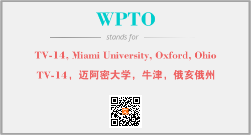 上述内容是“TV-14, Miami University, Oxford, Ohio”作为“WPTO”的缩写,解释为“TV-14,迈阿密大学,牛津,俄亥俄州”时的信息,以及英文缩略词WPTO所代表的英文单词,其对应的中文拼音、详细解释以及在英文中的流行度和相关分类、应用领域及应用示例等。