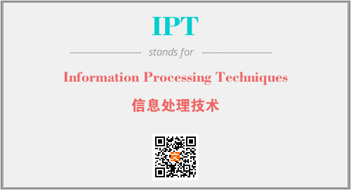 英文缩略词“IPT”经常作为“Information Processing Techniques”的英文缩写来使用,中文表示:“信息处理技术”。本文将详细介绍英文缩写词IPT所代表英文单词,其对应的中文拼音、详细解释以及在英语中的流行度。此外,还有关于缩略词IPT的分类、应用领域及相关应用示例等。