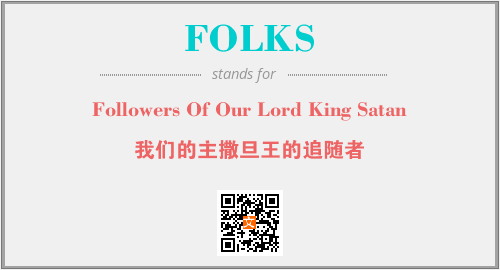 上述内容是“Followers Of Our Lord King Satan”作为“FOLKS”的缩写,解释为“我们的主撒旦王的追随者”时的信息,以及英文缩略词FOLKS所代表的英文单词,其对应的中文拼音、详细解释以及在英文中的流行度和相关分类、应用领域及应用示例等。