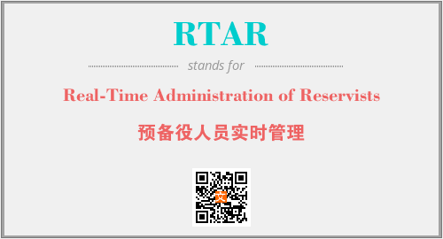 英文缩略词“RTAR”经常作为“Real-Time Administration of Reservists”的英文缩写来使用,中文表示:“预备役人员实时管理”。本文将详细介绍英文缩写词RTAR所代表英文单词,其对应的中文拼音、详细解释以及在英语中的流行度。此外,还有关于缩略词RTAR的分类、应用领域及相关应用示例等。