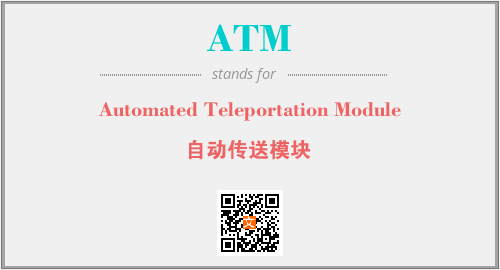 上述内容是“Automated Teleportation Module”作为“ATM”的缩写,解释为“自动传送模块”时的信息,以及英文缩略词ATM所代表的英文单词,其对应的中文拼音、详细解释以及在英文中的流行度和相关分类、应用领域及应用示例等。