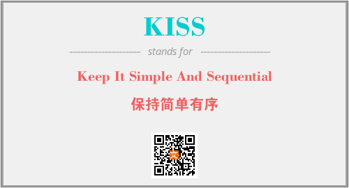 上述内容是“Keep It Simple And Sequential”作为“KISS”的缩写,解释为“保持简单有序”时的信息,以及英文缩略词KISS所代表的英文单词,其对应的中文拼音、详细解释以及在英文中的流行度和相关分类、应用领域及应用示例等。