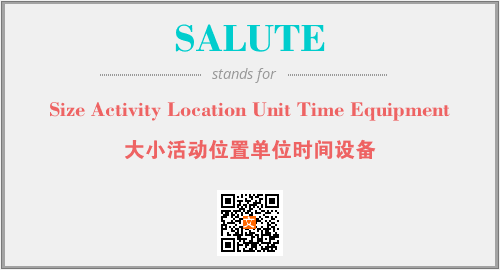 上述内容是“Size Activity Location Unit Time Equipment”作为“SALUTE”的缩写,解释为“大小活动位置单位时间设备”时的信息,以及英文缩略词SALUTE所代表的英文单词,其对应的中文拼音、详细解释以及在英文中的流行度和相关分类、应用领域及应用示例等。
