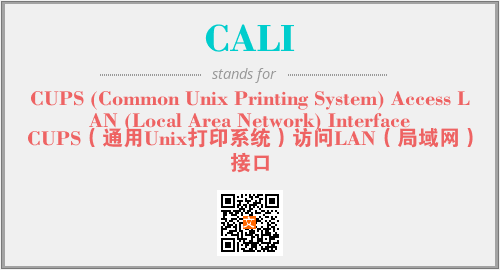 上述内容是“CUPS (Common Unix Printing System) Access LAN (Local Area Network) Interface”作为“CALI”的缩写,解释为“CUPS(通用Unix打印系统)访问LAN(局域网)接口”时的信息,以及英文缩略词CALI所代表的英文单词,其对应的中文拼音、详细解释以及在英文中的流行度和相关分类、应用领域及应用示例等。