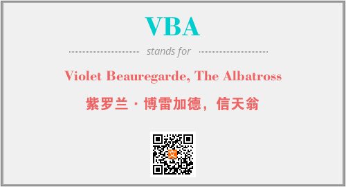 上述内容是“Violet Beauregarde, The Albatross”作为“VBA”的缩写,解释为“紫罗兰·博雷加德,信天翁”时的信息,以及英文缩略词VBA所代表的英文单词,其对应的中文拼音、详细解释以及在英文中的流行度和相关分类、应用领域及应用示例等。